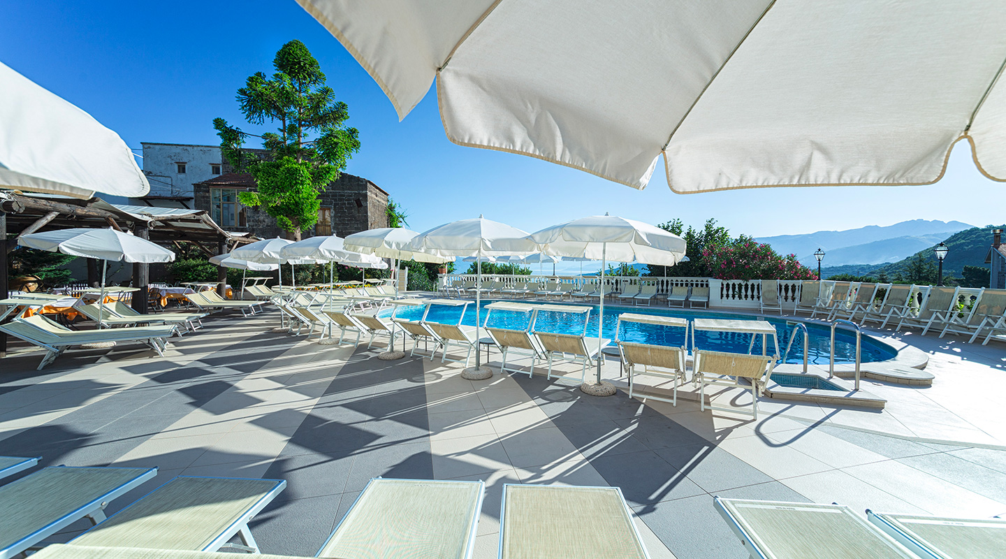 La piscine avec vue panoramique, où le soleil brille toute la journée, est le lieu idéal pour passer des heures de détente et de tranquillité sur les chaises longues équipées de parasols et de serviettes de plage. Le bar de la piscine propose un service de boissons au bord de la piscine et un service de collations sur la terrasse.